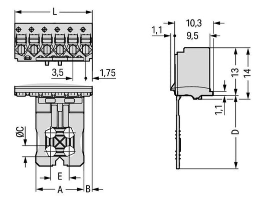 2091-1105 WAGO Conector hembra para 1 conductor; Tecla; Push-in CAGE CLAMP®; 1,5 mm²; Paso 3,5 mm; 5 polos; Placa anti-tirón; 1,50 mm²; gris claro