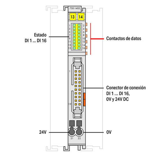 750-1402 WAGO Entrada digital, 16 canales; 24 V DC; 3 ms; conmutación negativa (NPN); Cable plano