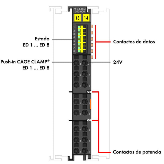 750-1415/040-000 WAGO Entrada digital, 8 canales; 24 V DC; 3 ms; Conexión para 2 conductores; extremo