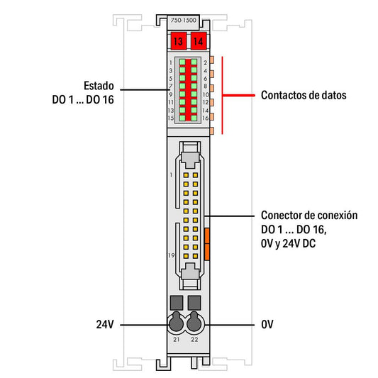750-1501 WAGO Salida digital, 16 canales; 24 V DC; 0,5 A; conmutación negativa (NPN); Cable plano