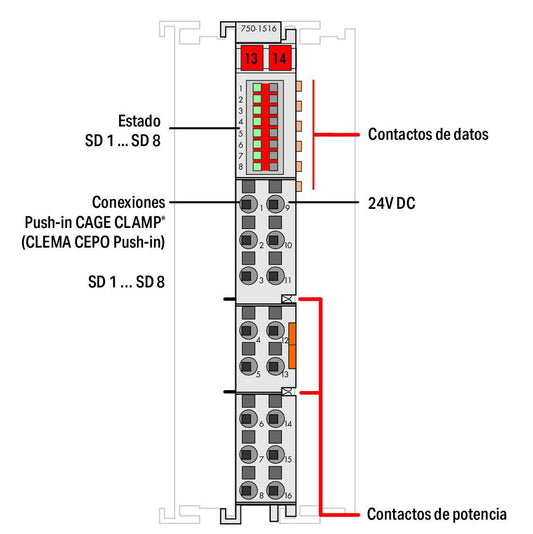 750-1516 WAGO Salida digital, 8 canales; 24 V DC; 0,5 A; conmutación negativa (NPN); Conexión para 2 conductores
