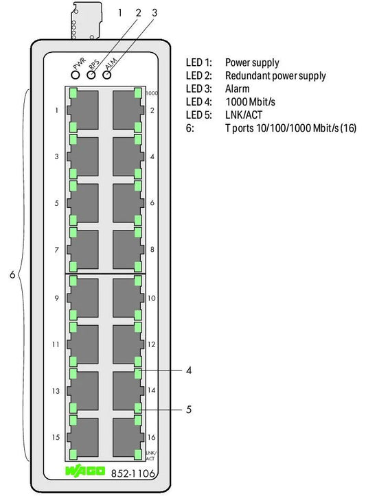 852-1106 WAGO Industrial-Switch; 16 puertos 1000Base-T; Rango de temperaturas ampliado; negro metalizado