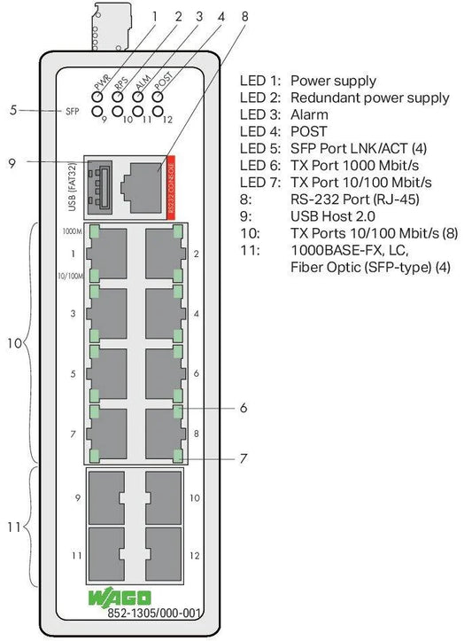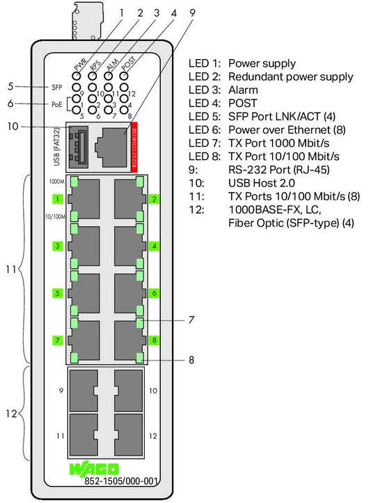 852-1505/000-001 WAGO Conmutador gestionado industrial; 8 puertos 1000Base-T; 4 ranuras 1000Base-SX/LX; Rango de temperaturas ampliado; 8 * Alimentación a través de Ethernet; USB