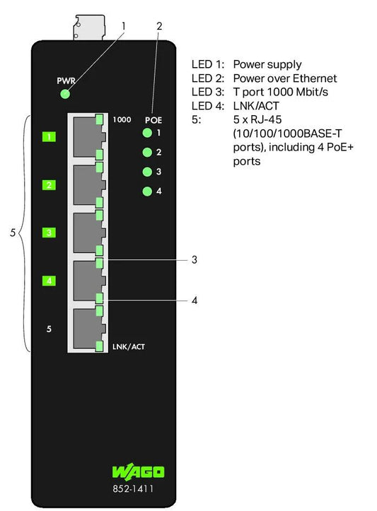852-1411 WAGO Industrial-ECO-Switch; 5 puertos 1000Base-T; Rango de temperaturas ampliado; 4 * Power over Ethernet