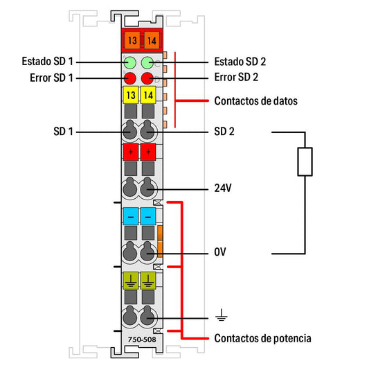 750-508/000-800 WAGO Salida digital, 2 canales; 24 V DC; 2,0 A; sin retroacción; Diagnóstico