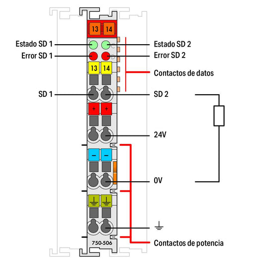 750-506/000-800 WAGO Salida digital, 2 canales; 24 V DC; 0,5 A; sin retroacción; Diagnóstico