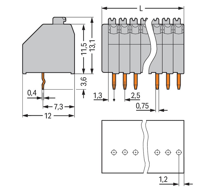 250-302 WAGO Borna para placas de circuito impreso; 2 polos; Gris