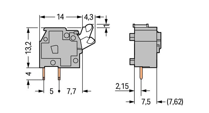 Borna apilable para placas de circuito impreso con tecla de accionamiento, capacidad de 2,5 mm², paso de 7,5/7,62 mm y 1 polo. Incorpora tecnología CAGE CLAMP® para una conexión rápida y segura, con posibilidad de puenteado. Color gris. Ideal para aplicaciones donde se requiere una conexión eficiente, compacta y reutilizable en sistemas electrónicos o de automatización