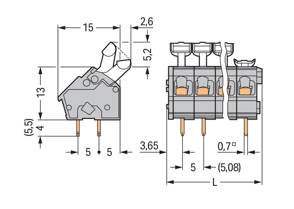 Borna para placas de circuito impreso, tipo tecla, para conductores de 2,5 mm². Con 6 polos y paso de 5/5,08 mm. Sistema de conexión CAGE CLAMP® con posibilidad de puenteado. Color gris. Perfecta para instalaciones eléctricas que requieren conexiones seguras y flexibles.