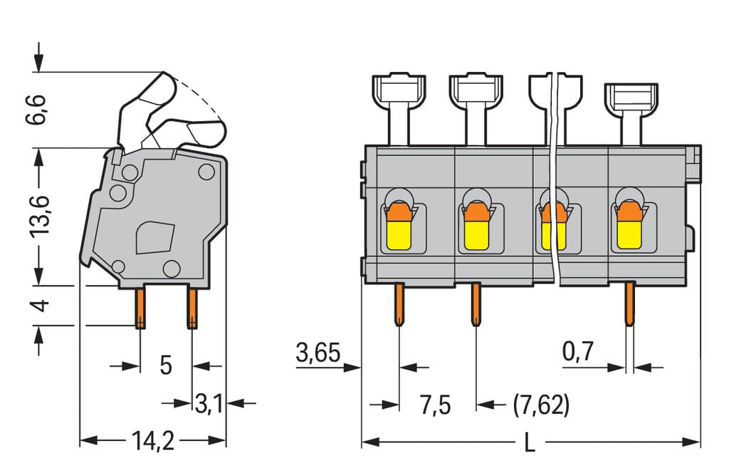 Borna para placas de circuito impreso con tecla, 12 polos y paso de 7,5/7,62 mm. Compatible con conductores de hasta 2,5 mm², incorpora tecnología CAGE CLAMP® para conexiones rápidas y seguras sin herramientas. Color gris, con posibilidad de puenteado, ideal para aplicaciones modulares y distribución eficiente del potencial eléctrico en sistemas PCB.