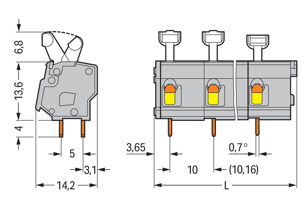 Borna para placas de circuito impreso con tecla, 12 polos y paso de 10/10,16 mm. Compatible con conductores de hasta 2,5 mm², equipada con tecnología CAGE CLAMP® para conexiones rápidas y seguras sin herramientas. Color gris, con posibilidad de puenteado, ideal para aplicaciones modulares y distribución eficiente del potencial eléctrico en sistemas PCB.