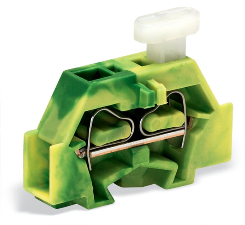 Borna para 2 conductores, con tecla de accionamiento en un lado y brida de fijación. Compatible con montaje mediante tornillos u otros sistemas de fijación similares. Incluye orificio de fijación Ø 3,2 mm y admite secciones de hasta 2,5 mm² con tecnología CAGE CLAMP®. Diseño de 1 polo, color verde-amarillo, garantizando conexión segura, confiable y de fácil instalación