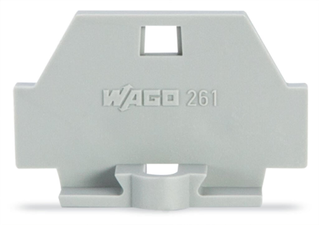 Placa final con brida de fijación, diseñada para proporcionar un cierre seguro y estable en regletas de bornas. De color gris, ofrece resistencia mecánica y una instalación confiable, asegurando una terminación ordenada y profesional en los sistemas de conexión