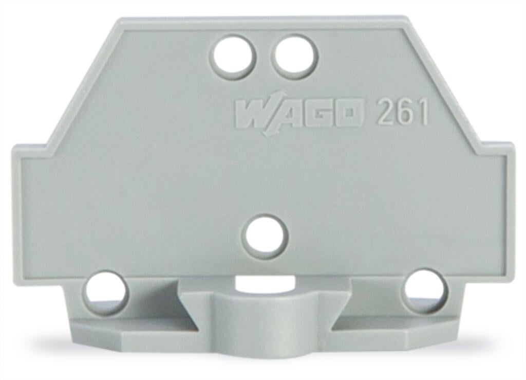 Placa final gris con brida de fijación, diseñada para cerrar y asegurar el extremo de regletas de bornas. Su función es proporcionar estabilidad mecánica y protección en la instalación, evitando el contacto accidental con partes conductoras. Ofrece un acabado seguro, ordenado y resistente en sistemas de conexión eléctrica
