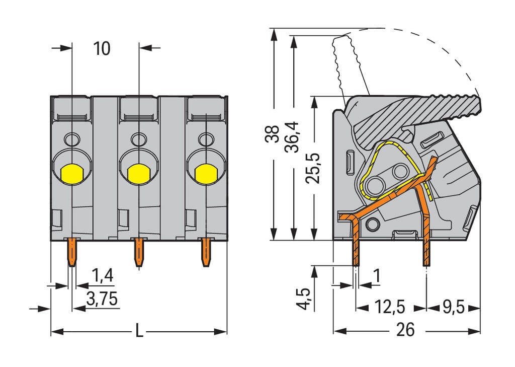 Borna para placas de circuito impreso con palanca, 9 polos, apta para conductores de hasta 6 mm². Presenta un paso de 10 mm y tecnología CAGE CLAMP® que asegura conexiones confiables y rápidas. Su color gris permite fácil identificación en el panel, siendo ideal para sistemas de automatización, control eléctrico e instalaciones industriales