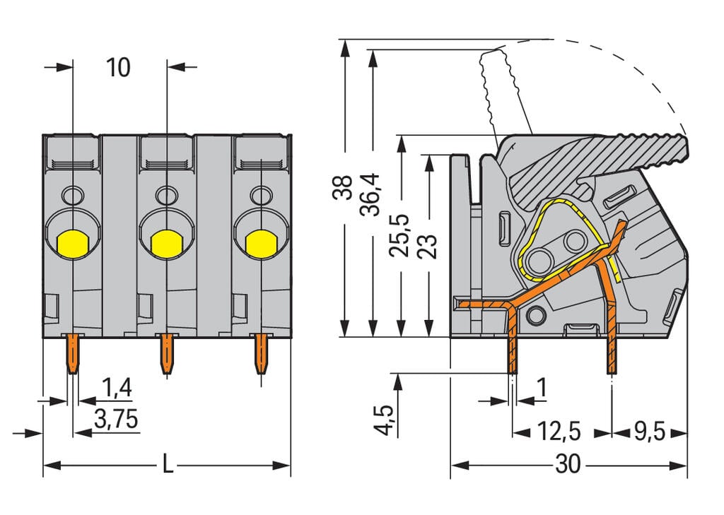 Borna para placas de circuito impreso con palanca, 4 polos, para conductores de hasta 6 mm². Presenta un paso de 10 mm y tecnología CAGE CLAMP® para conexiones seguras y confiables. Incluye posibilidad de puenteado, facilitando la interconexión de polos. Su color gris permite una rápida identificación en tableros eléctricos y sistemas de control industrial