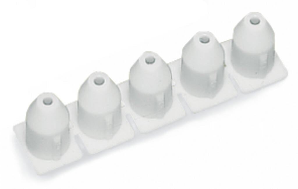 Embudos aislantes para cables de 0,08 – 0,2 mm² ("r") o 0,14 mm² ("f"), en color blanco, presentados en 5 unidades por tira. Diseñados para proteger y aislar los extremos de conductores, facilitando la inserción segura en bornas o conectores, evitando daños al conductor y asegurando conexiones eléctricas confiables en instalaciones industriales o de automatización
