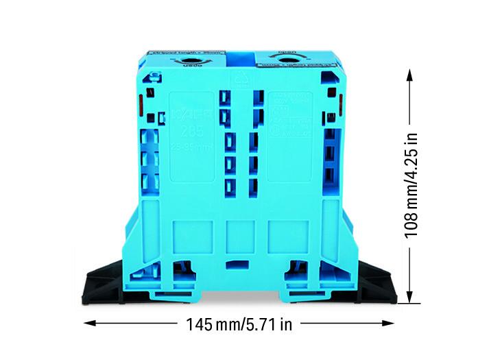 Borna de paso para 2 conductores de 95 mm², equipada con soportes de marcaje laterales y bridas de fijación. Cuenta con tecnología POWER CAGE CLAMP (CLEMA CEPO) que asegura conexiones firmes y confiables. Fabricada en color azul, facilita la identificación y organización de conductores en instalaciones eléctricas de alta capacidad