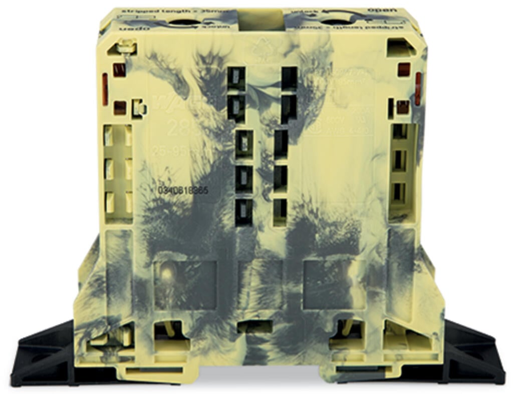 Borna de paso para 2 conductores de 95 mm², con soportes de marcaje laterales y bridas de fijación. Incorpora tecnología POWER CAGE CLAMP (CLEMA CEPO) para conexiones seguras y confiables. Fabricada en color gris oscuro-amarillo, facilita la identificación y organización de conductores en instalaciones eléctricas de alta capacidad