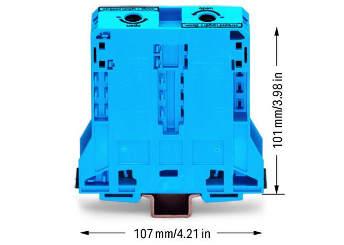Borna de paso para 2 conductores de 95 mm², diseñada exclusivamente para montaje en carril DIN 35 x 15. Incluye soportes de marcaje laterales para facilitar identificación y organización. Con tecnología POWER CAGE CLAMP (CLEMA CEPO), asegura conexiones firmes y confiables. Fabricada en color azul, adecuada para instalaciones eléctricas de alta capacidad