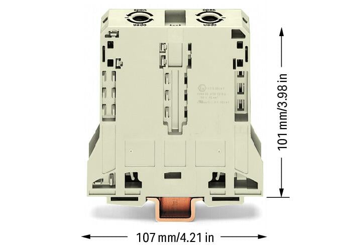 Borna de paso para 2 conductores de 95 mm², adecuada para aplicaciones Ex e II y montaje exclusivo en carril DIN 35 x 15. Equipada con soportes de marcaje laterales para una identificación clara y ordenada. Incorpora tecnología POWER CAGE CLAMP (CLEMA CEPO), que garantiza conexiones seguras y confiables. Fabricada en color gris claro, ideal para instalaciones eléctricas de alta capacidad.