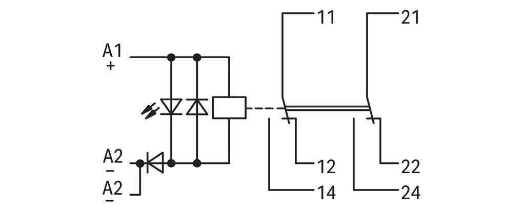 Módulo con relé de entrada nominal 24 V CC, con 2 contactos inversores de movimientos dirigidos y corriente límite en funcionamiento continuo de 5 A. Presenta un ancho de montaje de 19 mm y capacidad de conexión de 2,50 mm², ofreciendo control confiable y seguro en aplicaciones de automatización y sistemas eléctricos en carril DIN