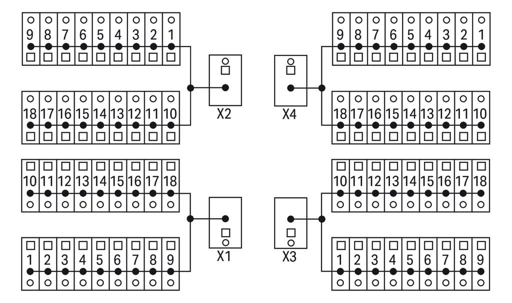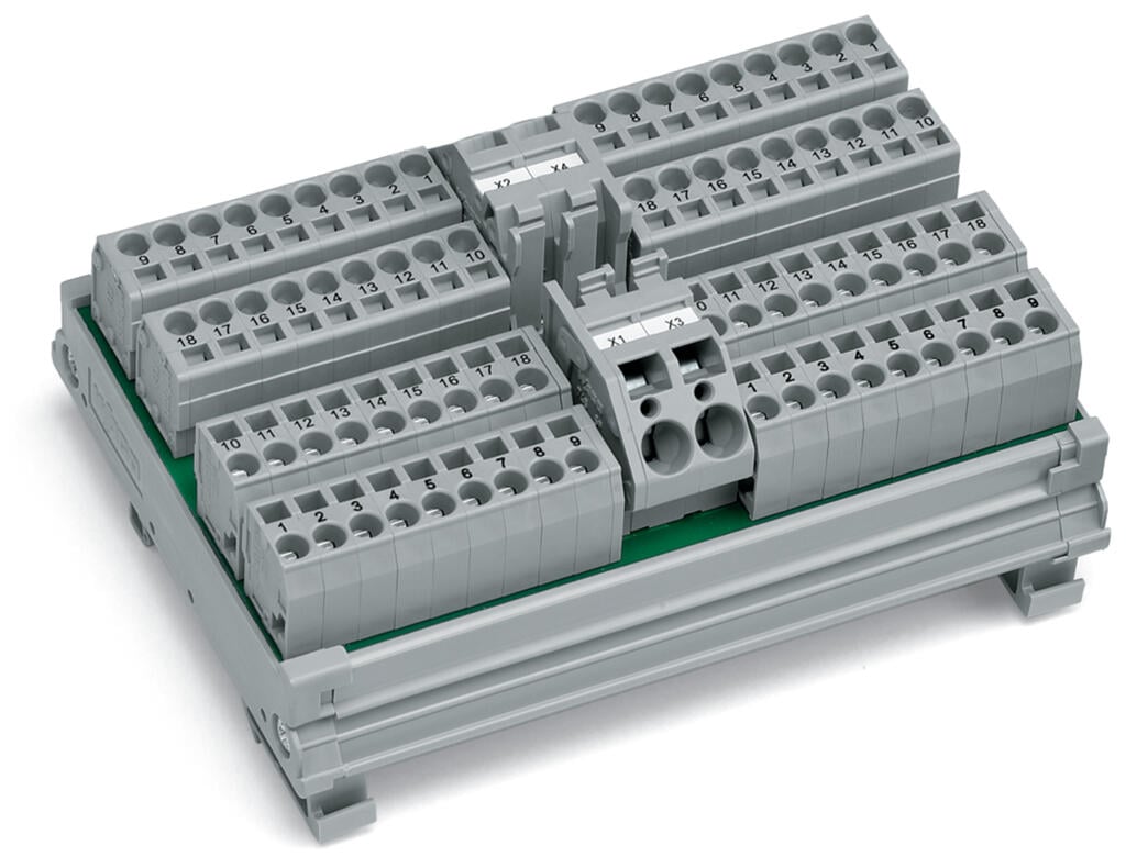 Módulo distribuidor de potencial con 4 potenciales independientes y un total de 19 puntos de conexión. Permite una distribución eficiente y ordenada de la alimentación en sistemas eléctricos o de control. Ideal para aplicaciones industriales que requieren múltiples derivaciones de tensión en espacios reducidos, garantizando una instalación limpia y segura en carril DIN