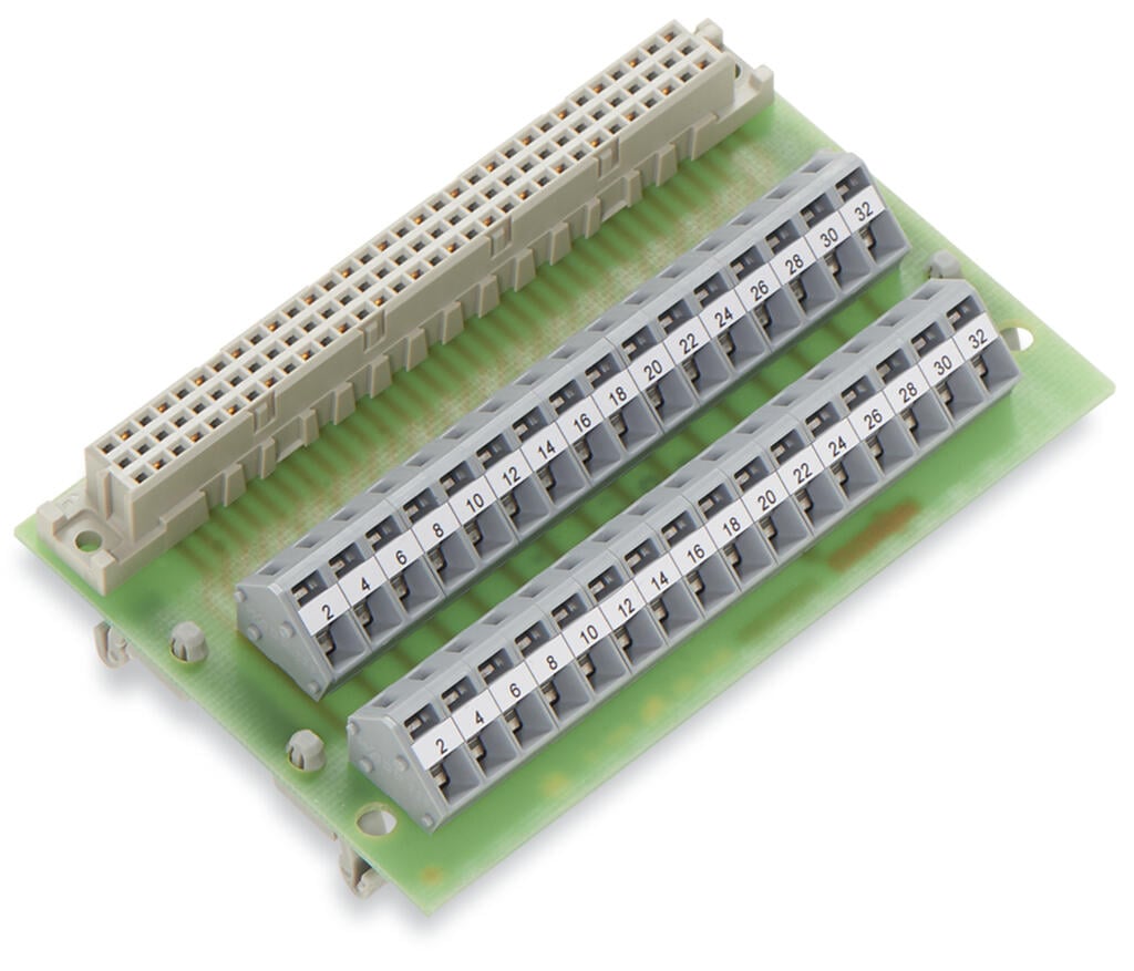Módulo de transmisión con conectores según DIN 41612 de 32 polos y diseño C, con contraconector de conexión soldada y dirección de enchufe vertical. Incluye bornas para placas de circuito impreso de 2 líneas y pies de montaje, garantizando instalación segura, transmisión confiable de señales y facilidad de mantenimiento en sistemas eléctricos e industriales
