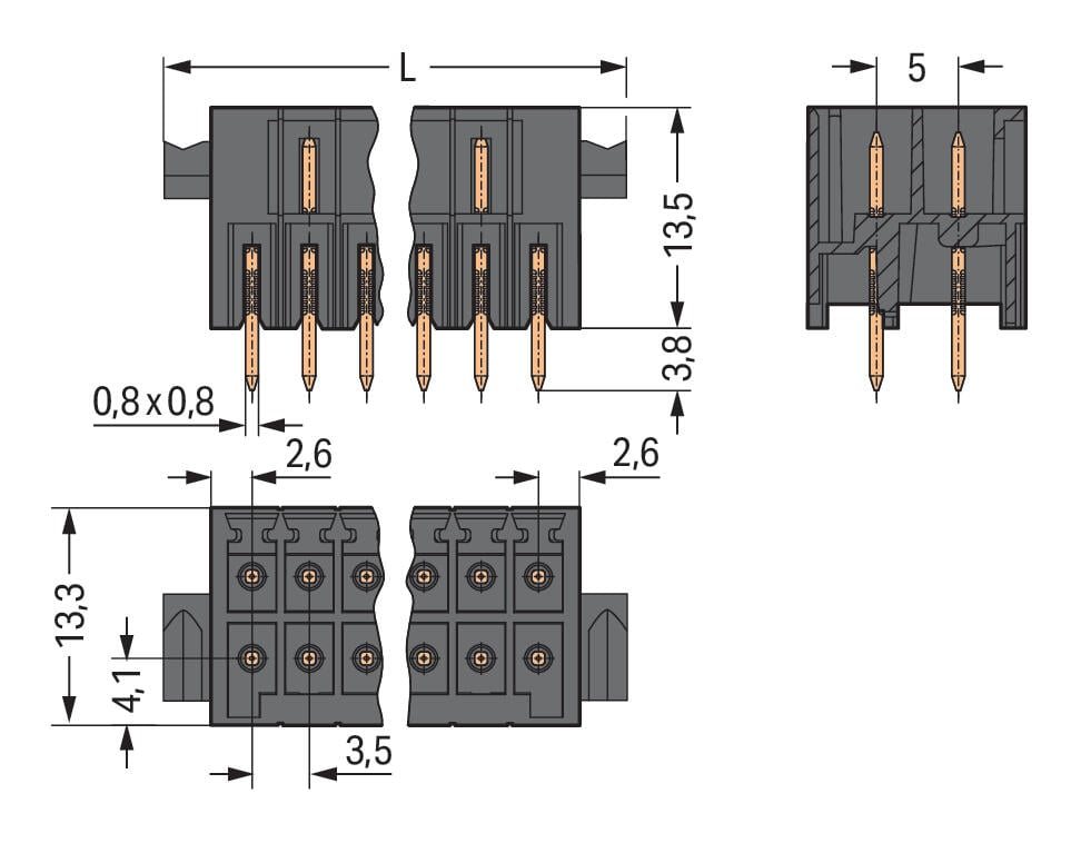 Conector macho THT de 2 líneas, pin soldable de 0,8 × 0,8 mm, recto, con separador y paso de 3,5 mm. Dispone de 14 polos, color negro, y ofrece protección total contra errores de conexión. Ideal para montaje seguro y preciso en placas electrónicas, garantizando confiabilidad y correcta alineación en aplicaciones que requieren conexiones THT robustas