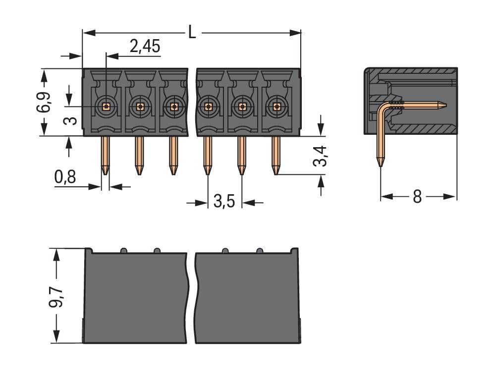 Conector macho THT con pines soldables de 0,8 × 0,8 mm, acodado, paso de 3,5 mm y 15 polos, color negro. Ideal para montaje en PCB, garantiza conexiones eléctricas seguras y confiables, con diseño angular que facilita el enrutamiento del cableado y optimiza el espacio en aplicaciones electrónicas e industriales