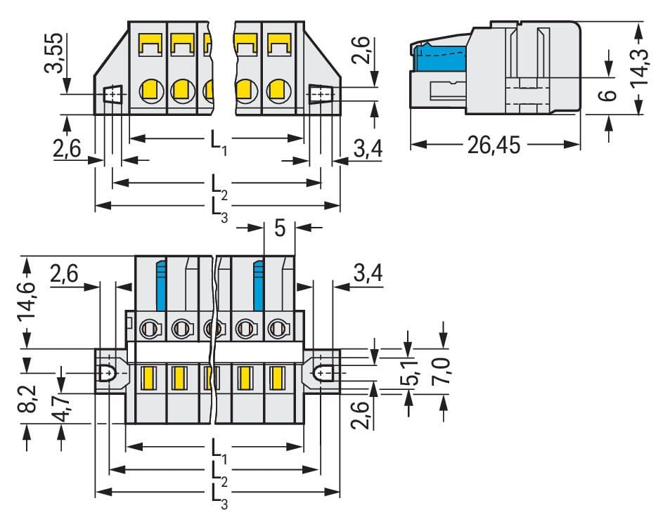 Conector hembra para 1 conductor, con tecnología CAGE CLAMP®, capacidad de 2,5 mm² y paso de 5 mm. Presenta 6 polos, protección total contra errores de conexión, brida de sujeción y color gris claro. Ideal para conexiones seguras, confiables y duraderas en aplicaciones eléctricas e industriales, con instalación estable y sencilla